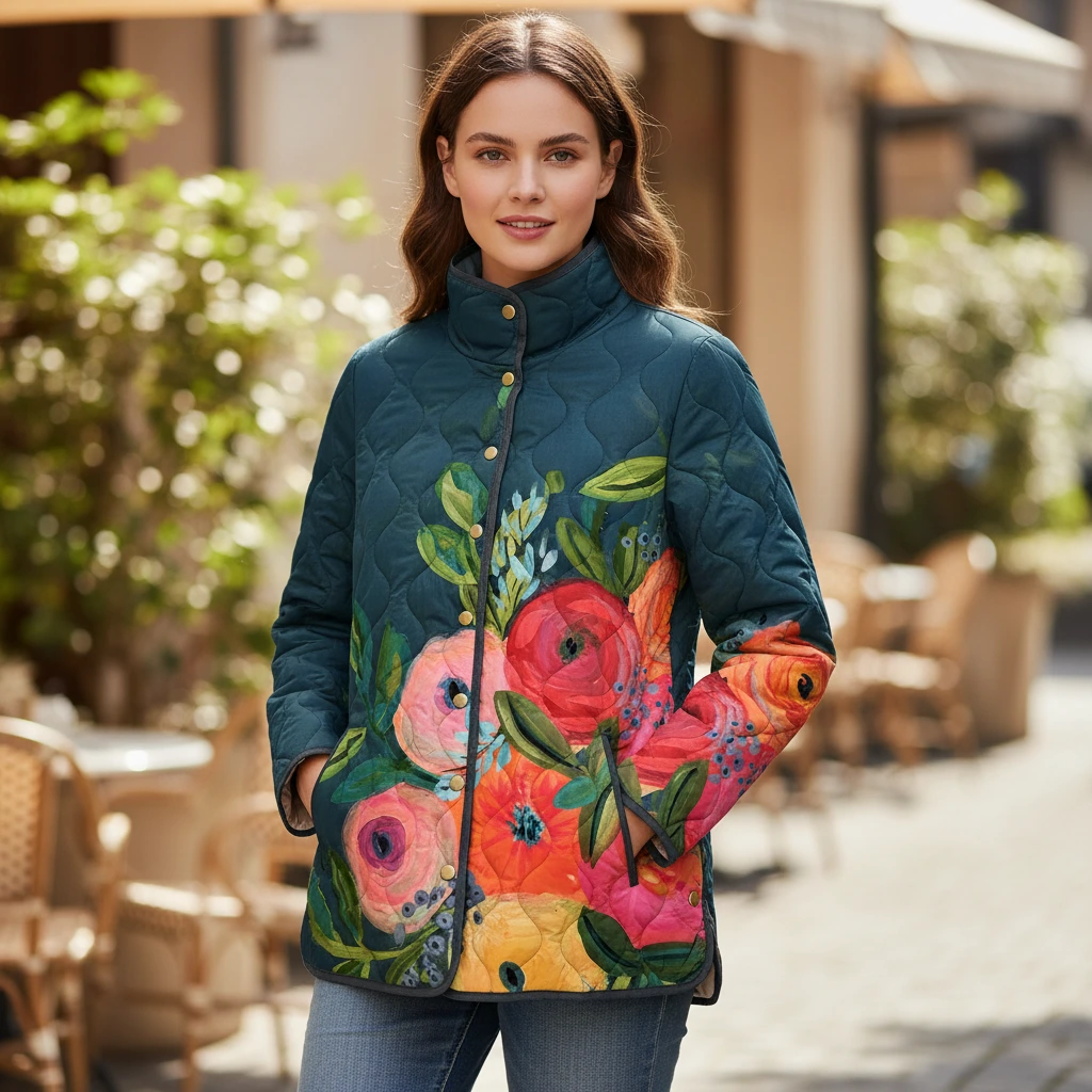 This quilted jacket features a softly structured silhouette with an all-over stitched texture and a bold floral pattern across the body. The snap-front closure and stand collar provide a clean, practical finish, while the lightweight padded construction makes it suitable for everyday layering. Designed to balance visual interest with function, this jacket works well as a transitional outerwear piece for casual daily wear.